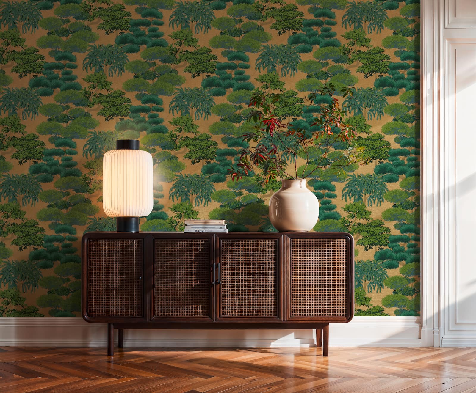 This wallpaper from the Cuba 2 collection by AS Creation combines a tropical lifestyle with modern interior design. It allows you to personalize your living spaces. The non-woven wallpaper 79161-2 features a tropical jungle motif with various trees in shades of green with a metallic gold effect. Discover the entire collection now in our shop.