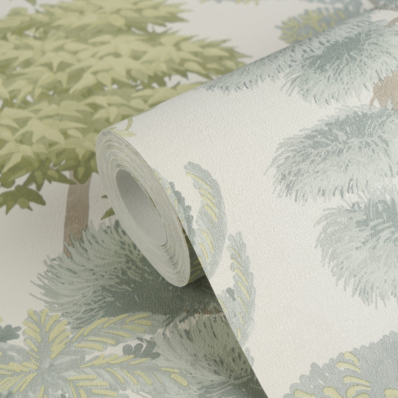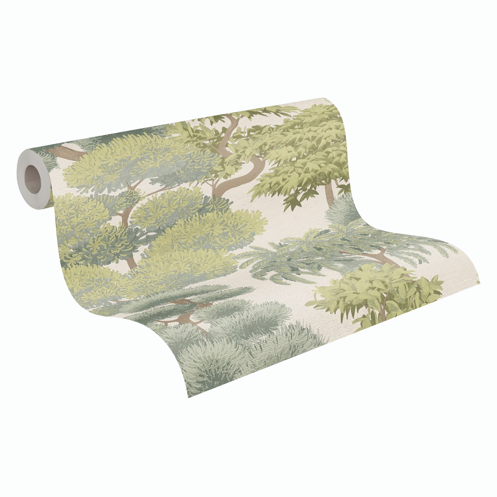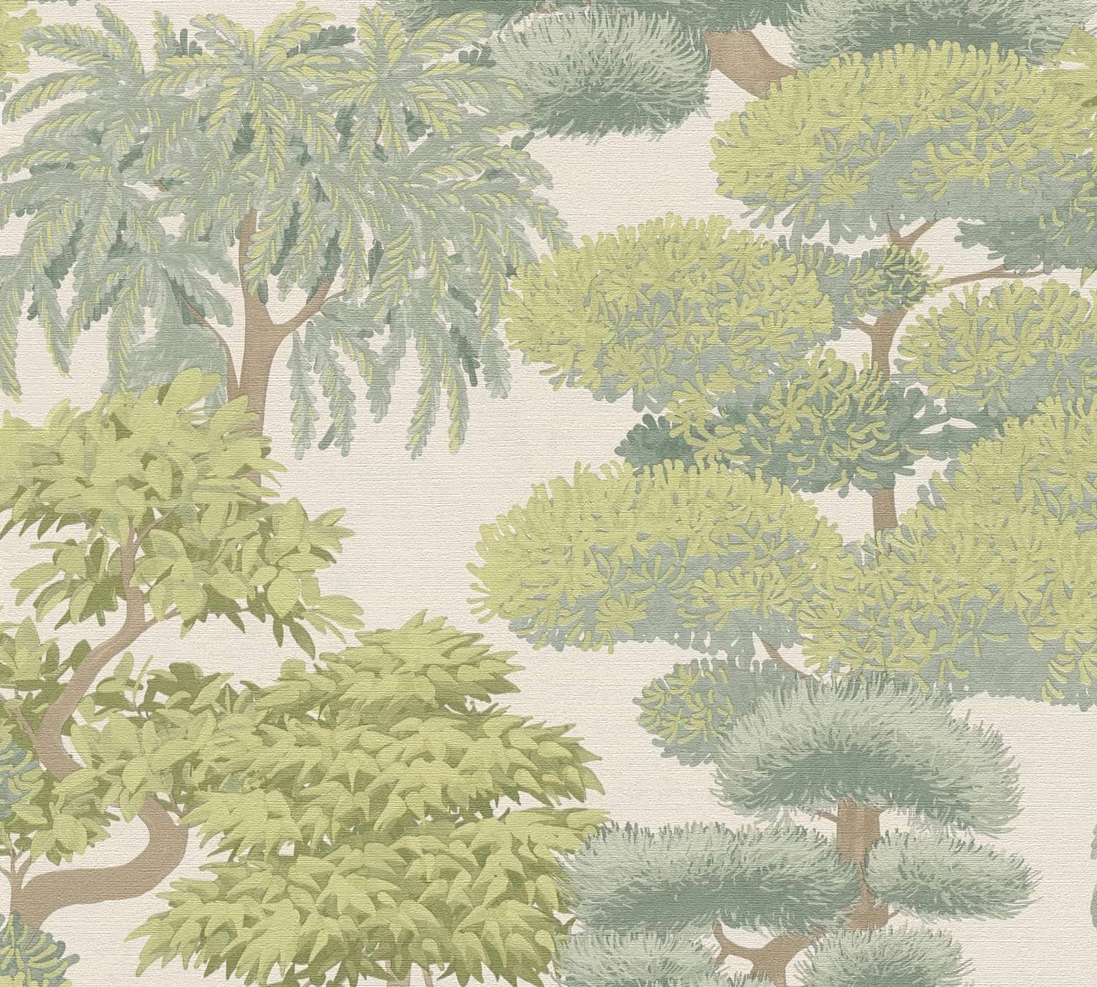 This wallpaper from the Cuba 2 collection by AS Creation combines a tropical lifestyle with modern interior design. It allows you to personalize your living spaces. The non-woven wallpaper 79161-3 features a tropical jungle motif with various trees in cream and green tones. Discover the entire collection now in our shop.