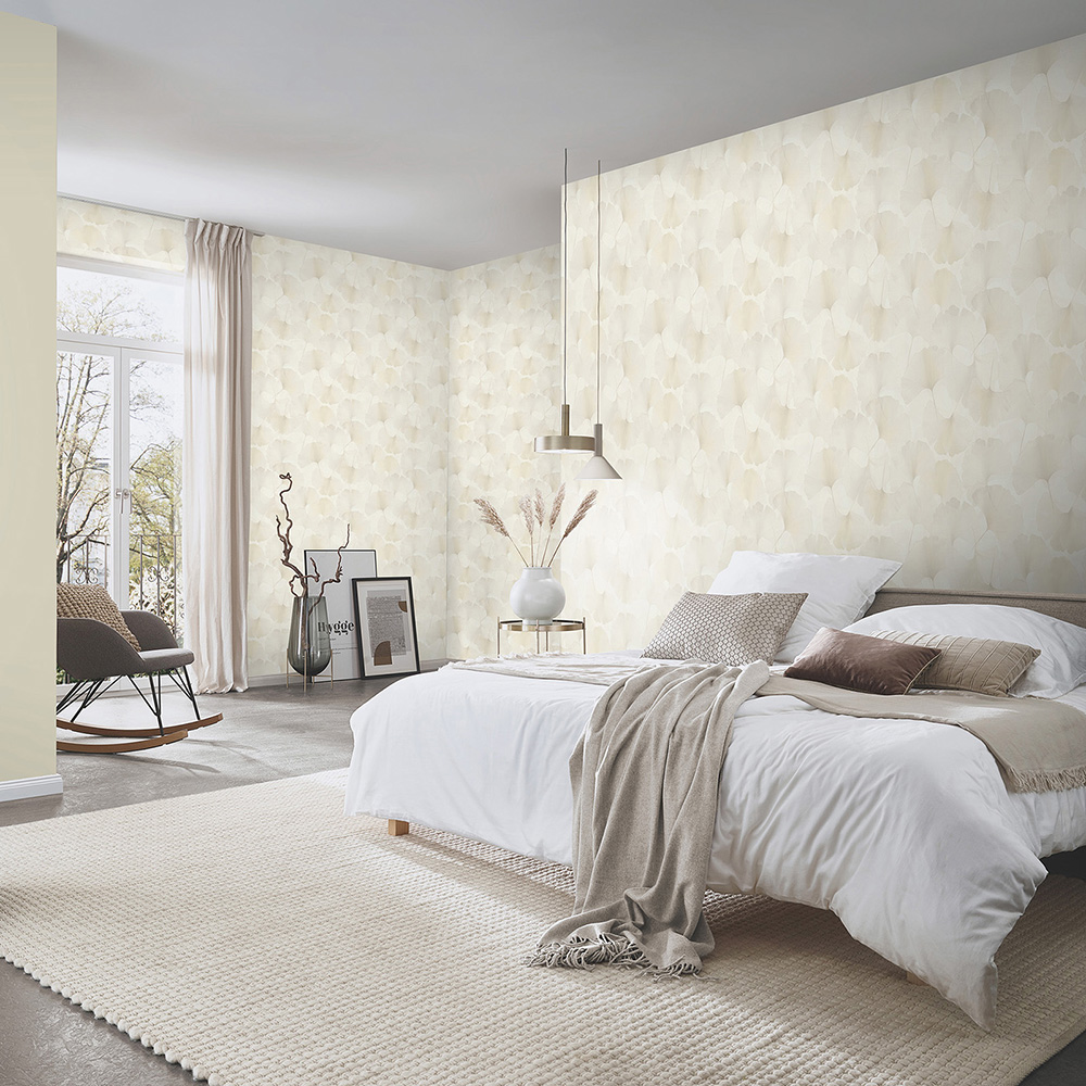 With this wallpaper from the "Elysium" collection by Erismann, you can stylishly design your rooms and turn them into a visual highlight. Timeless elegance meets modern extravagance, transforming every wall into a true eye-catcher. The non-woven wallpaper 10470-14 features a floral motif with gingko leaves in cream tones with a glitter effect. Discover the entire collection now in our shop.
