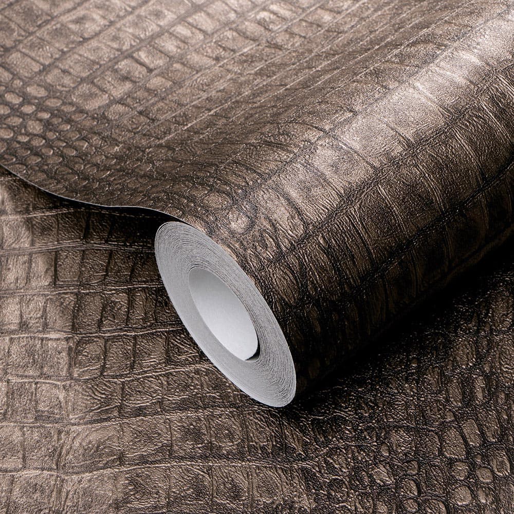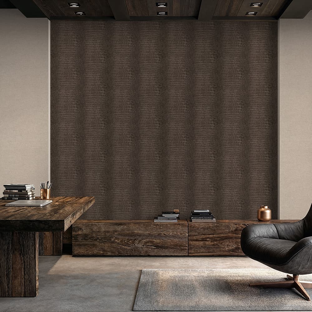 This wallpaper from the Forest Dreams collection by Erismann is inspired by the warm aesthetics of the Neo Nature trend and modern country style. It gives your rooms a noticeable depth and cosiness and has a soothing, stylish and sensual effect. The non-woven wallpaper 10560-11 features a motif reminiscent of crocodile leather in brown tones with a metallic effect. Discover all wallpapers in this collection in our shop.