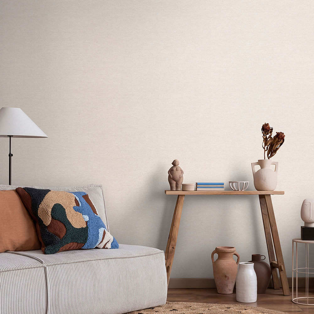 This wallpaper from the Forest Dreams collection by Erismann is inspired by the warm aesthetics of the Neo Nature trend and modern country style. It gives your rooms a noticeable depth and cosiness and has a soothing, stylish and sensual effect. The non-woven wallpaper 10563-14 is plain in textile look with subtle texture in beige and cream tones. Discover all wallpapers in this collection in our shop.