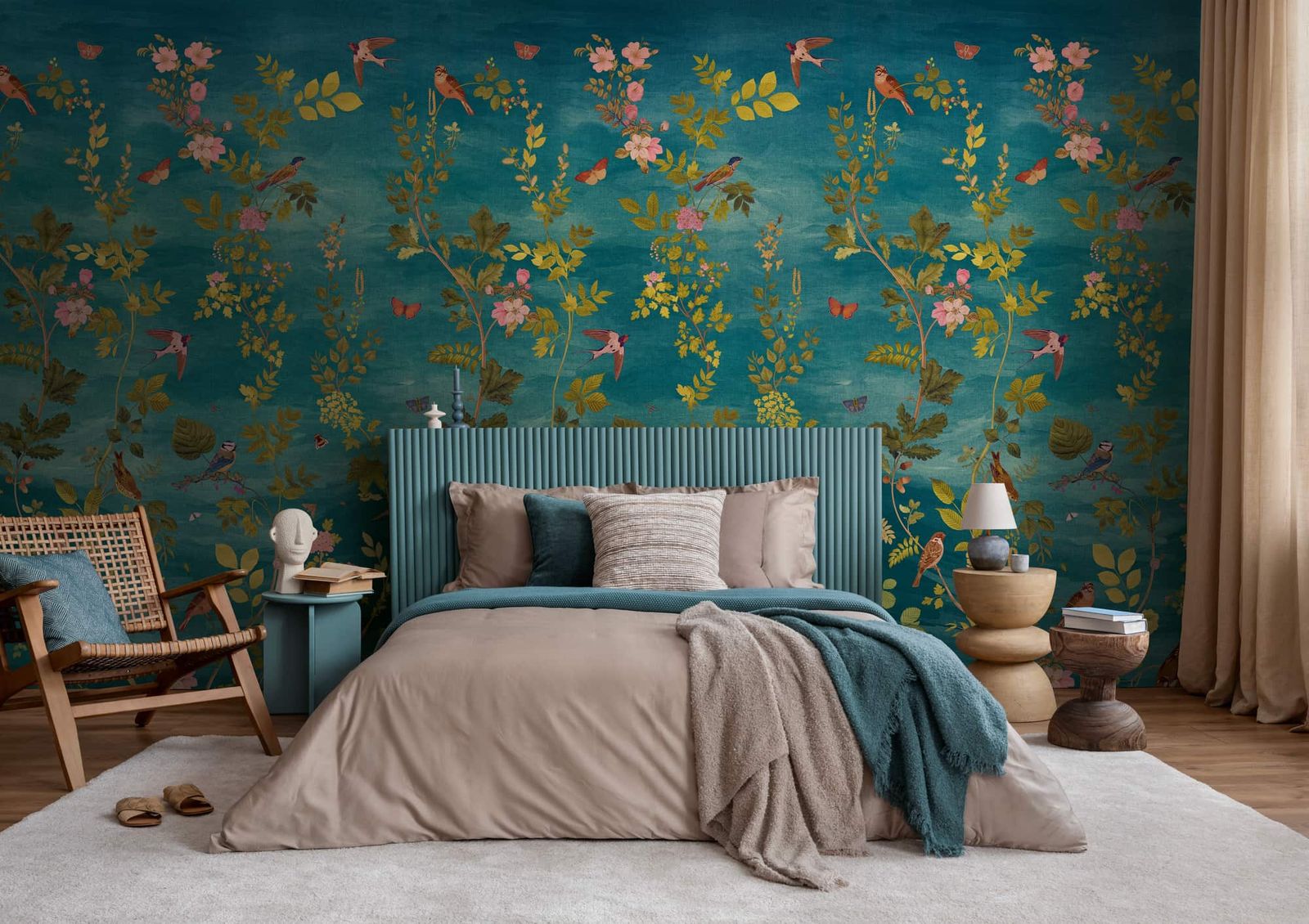 This wallpaper from the Metropolitan Stories - Vibes & Styles collection is for everyone who wants to not just live in their rooms, but truly arrive at their destination. It combines trend awareness, quality, and a welcoming atmosphere, making it perfect for modern living concepts. The non-woven wallpaper 79216-3 is a three-panel design featuring a floral motif with flowers, leaves, and birds in shades of blue, green, and pink. Discover the entire collection now in our shop.