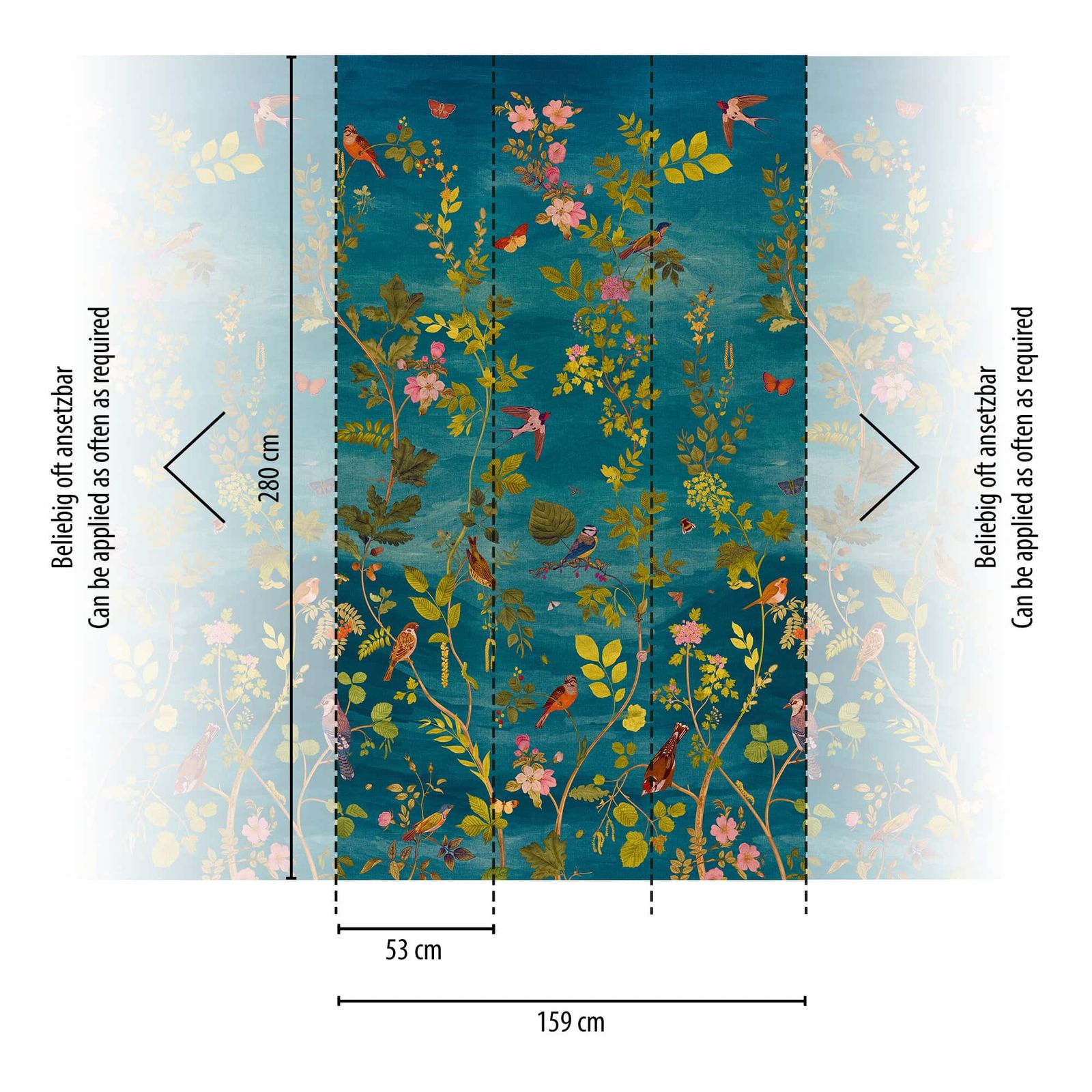 Floral photo wallpaper birds leaves blue green pink 79216-3