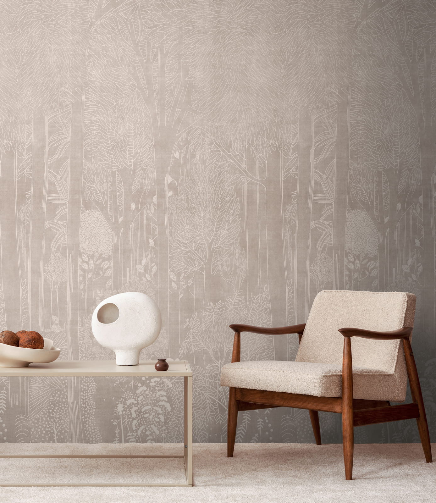 This wallpaper from the Metropolitan Stories - Vibes & Styles collection is for everyone who wants to not just live in their rooms, but truly arrive in them. It combines trend awareness, quality, and a welcoming atmosphere, making it perfect for modern living concepts. The non-woven wallpaper 79216-1 is a three-panel design featuring a nature motif with trees and plants in a line art style in beige and cream tones. Discover the entire collection now in our shop.