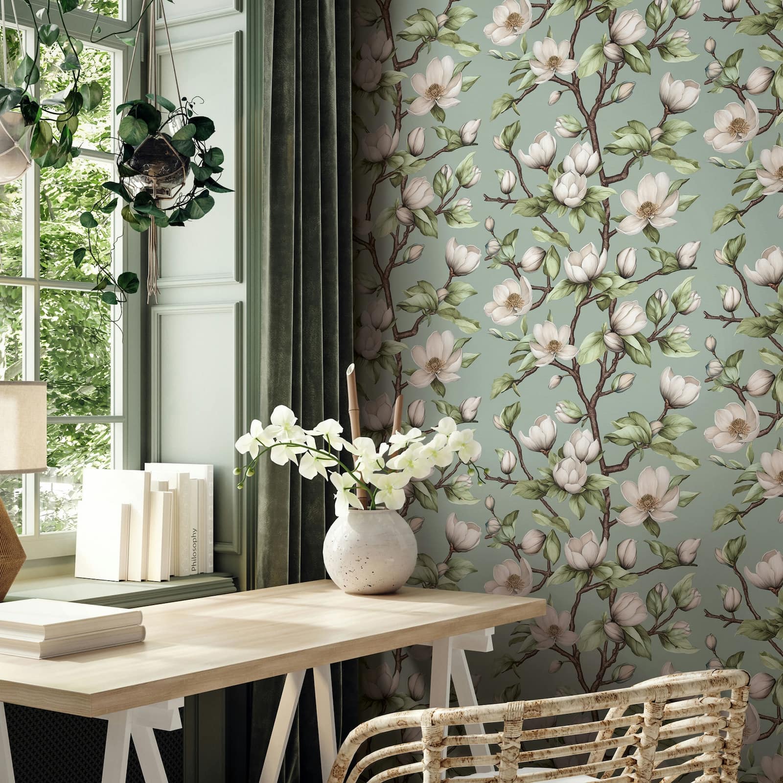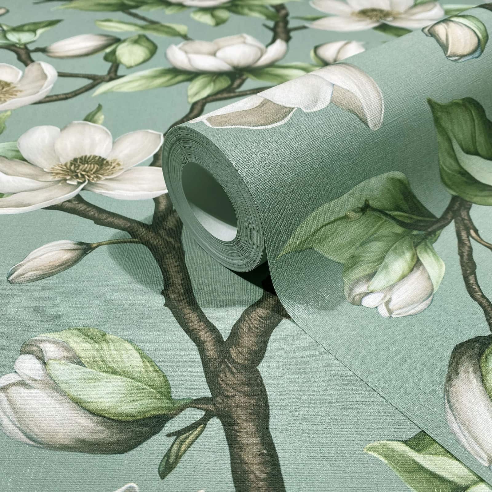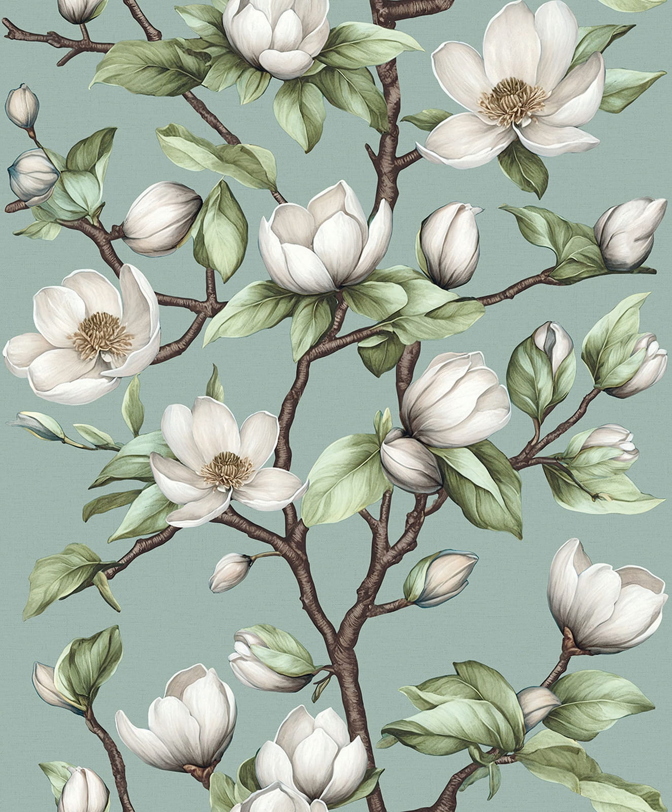 Let yourself be enchanted by a play of light, texture and gentle movement with this wallpaper from the collection Oriana by Novamur. It pays homage to the beauty of nature and the art of living and gives your rooms a magical atmosphere. The non-woven wallpaper 89037 features a floral motif with magnolias, leaves and branches in shades of blue, green and white. Discover the entire collection now in our shop.