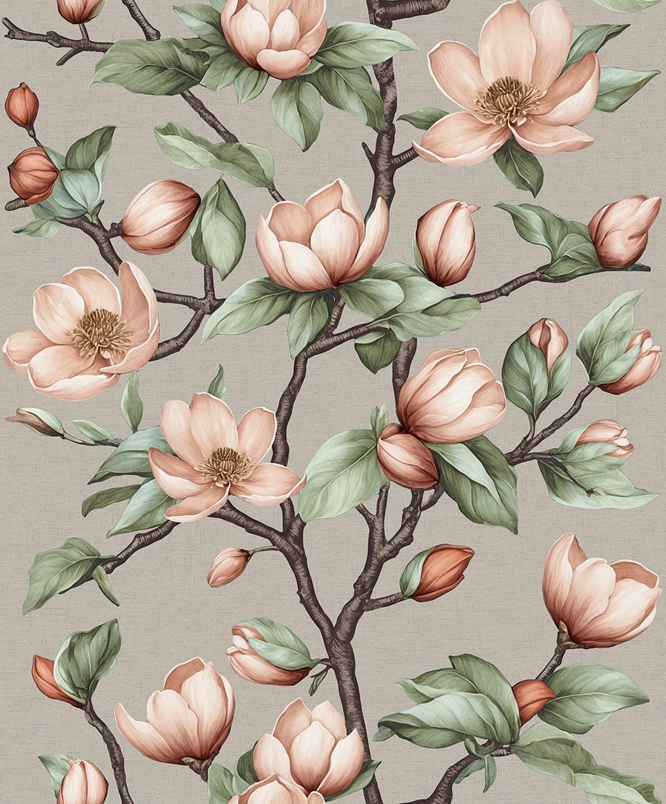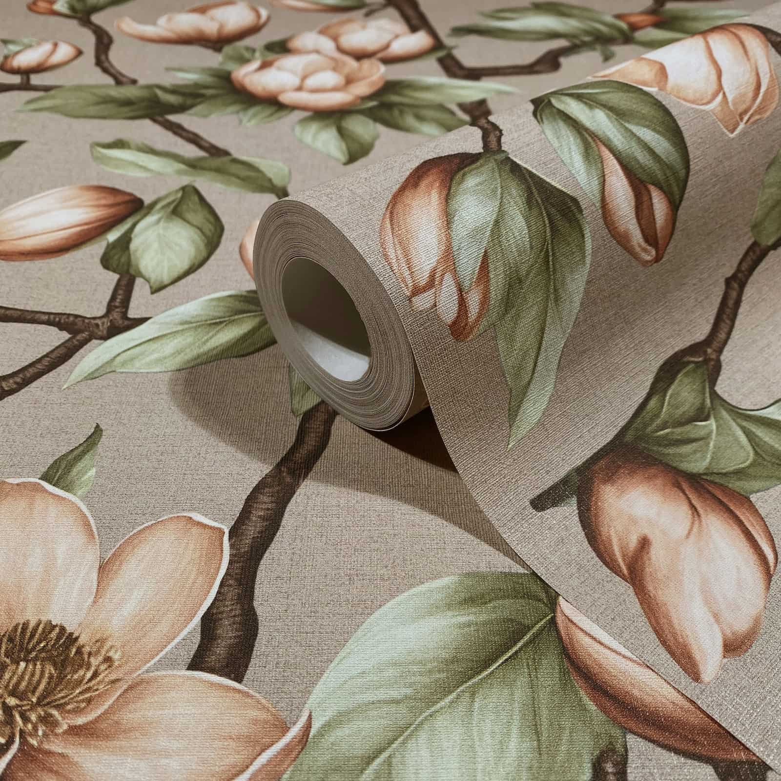 Let yourself be enchanted by a play of light, texture and gentle movement with this wallpaper from the collection Oriana by Novamur. It pays homage to the beauty of nature and the art of living and gives your rooms a magical atmosphere. The non-woven wallpaper 89033 features a floral motif with magnolias, leaves and branches in shades of grey, green and pink. Discover the entire collection now in our shop.