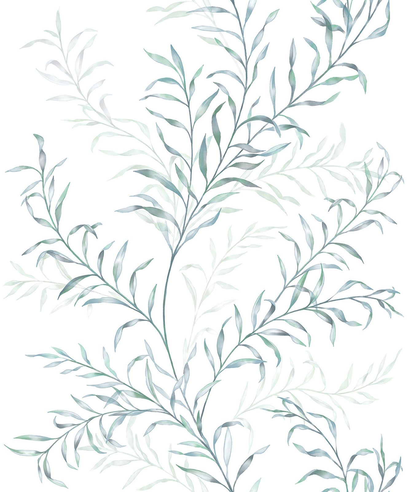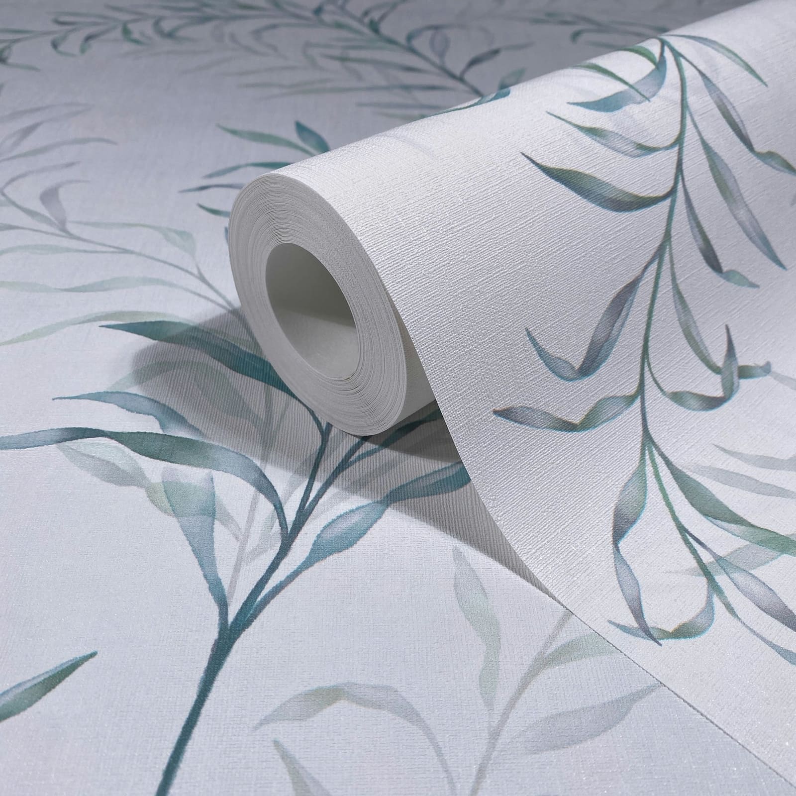 Non-woven Wallpaper Leaves Tendrils White Blue Green 89014
