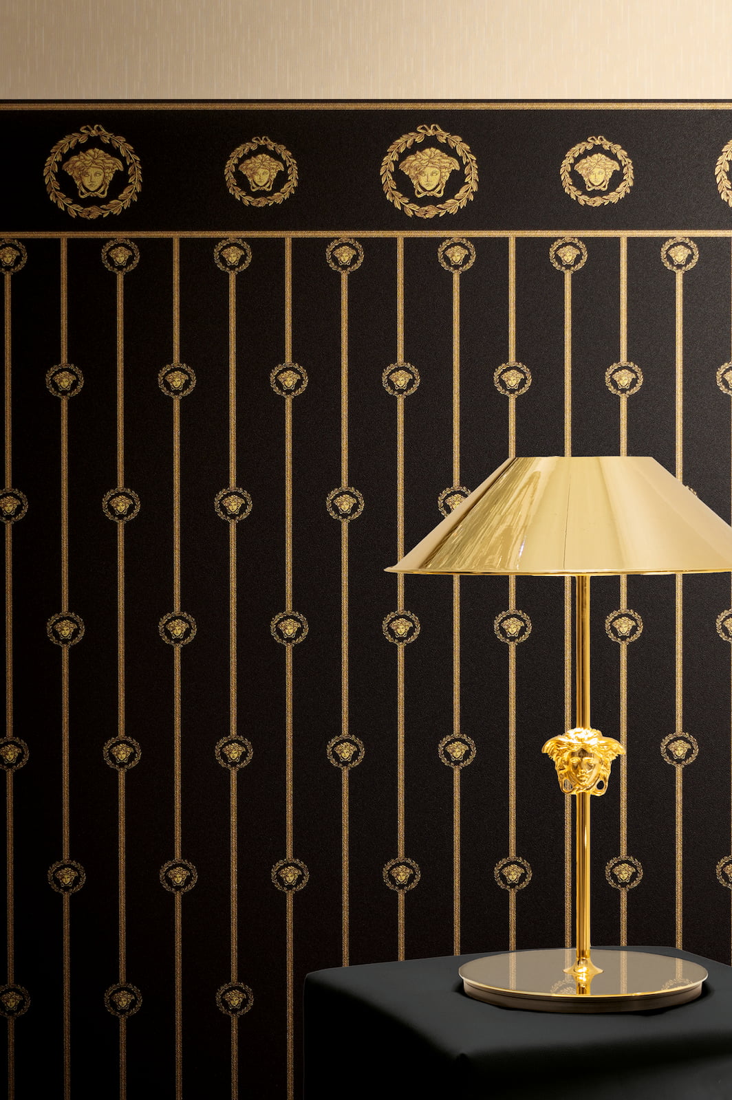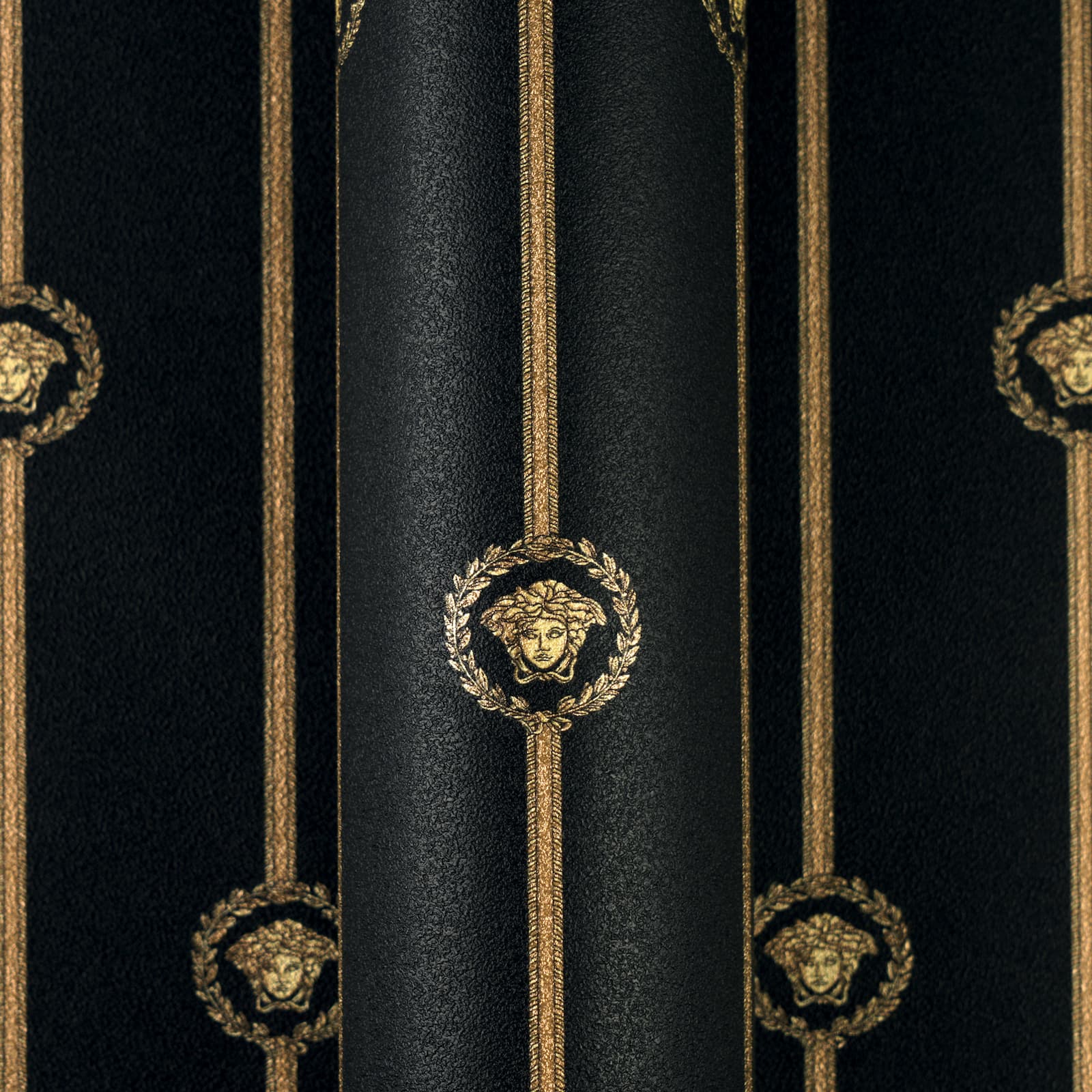This exquisite wallpaper, from AS Creation's sixth wallpaper collection in collaboration with Versace, opens a new chapter in luxurious wall coverings. Inspired by the DNA of the Versace fashion house, it is interpreted in a contemporary design language. The non-woven wallpaper 79131-2 features a motif with vertical stripes and a border-like band, culminating in a black Medusa emblem with a metallic gold effect. Discover the complete collection in our shop and bring a touch of luxury into your home.