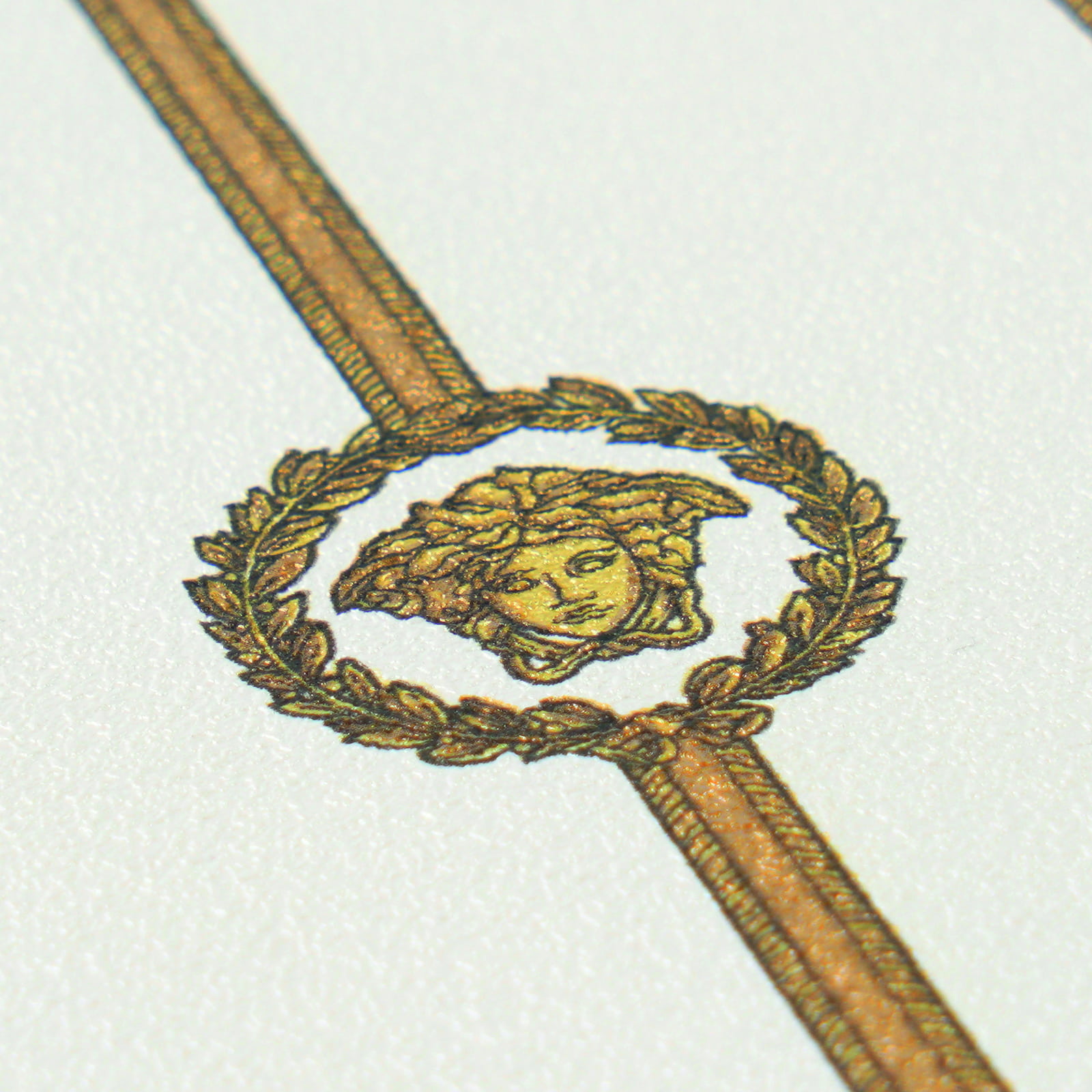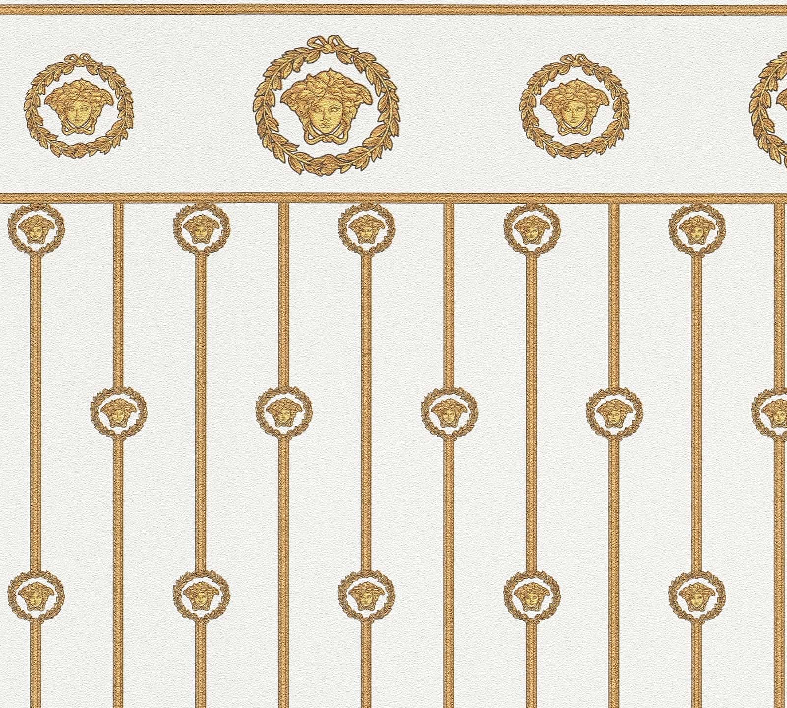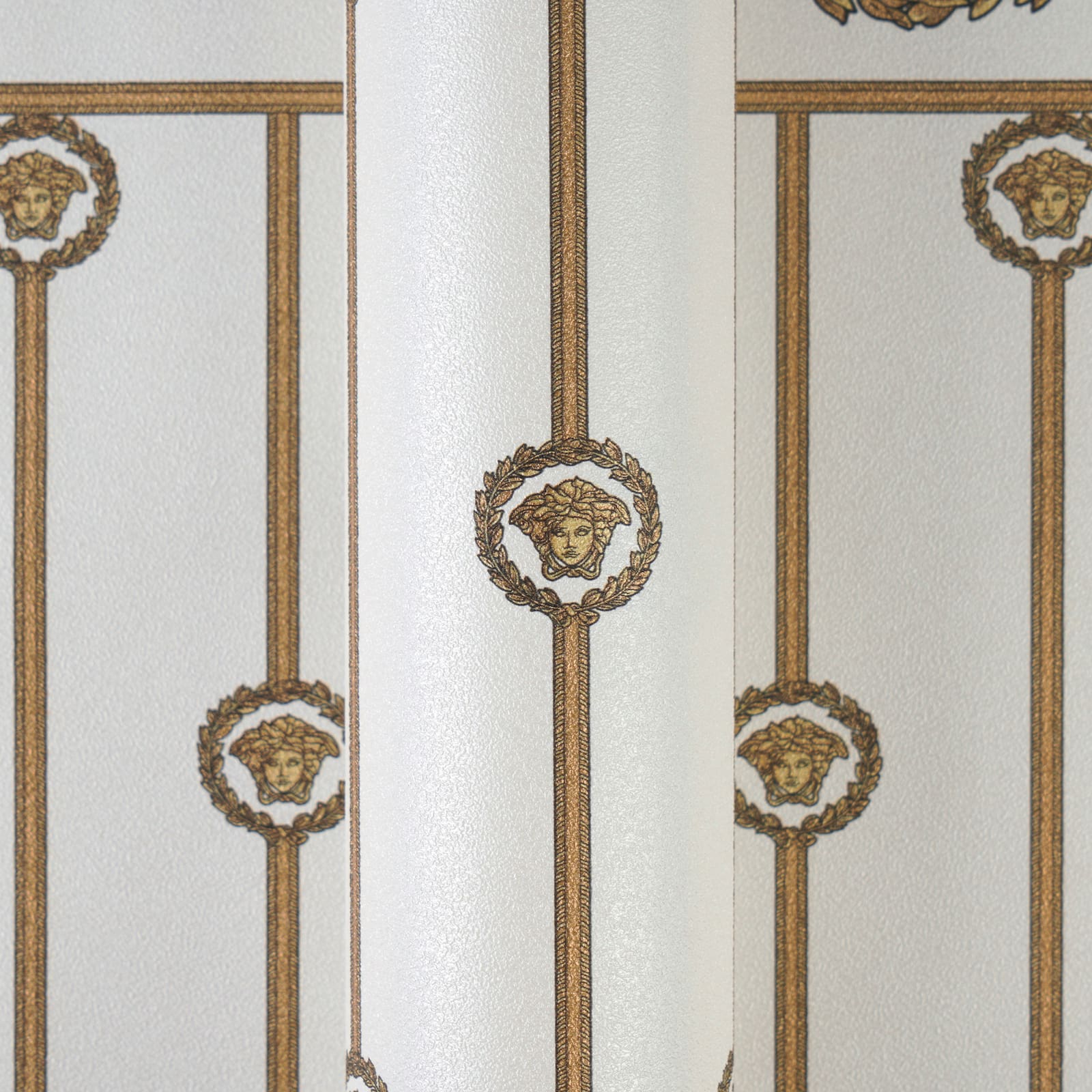 This exquisite wallpaper, from AS Creation's sixth wallpaper collection in collaboration with Versace, opens a new chapter in luxurious wall coverings. Inspired by the DNA of the Versace fashion house, it is interpreted with a contemporary design language. The non-woven wallpaper 79131-1 features a motif with vertical stripes and a border-like band, emblazoned with the Medusa emblem in cream tones with a metallic gold effect. Discover the complete collection in our shop and bring a touch of luxury into your home.