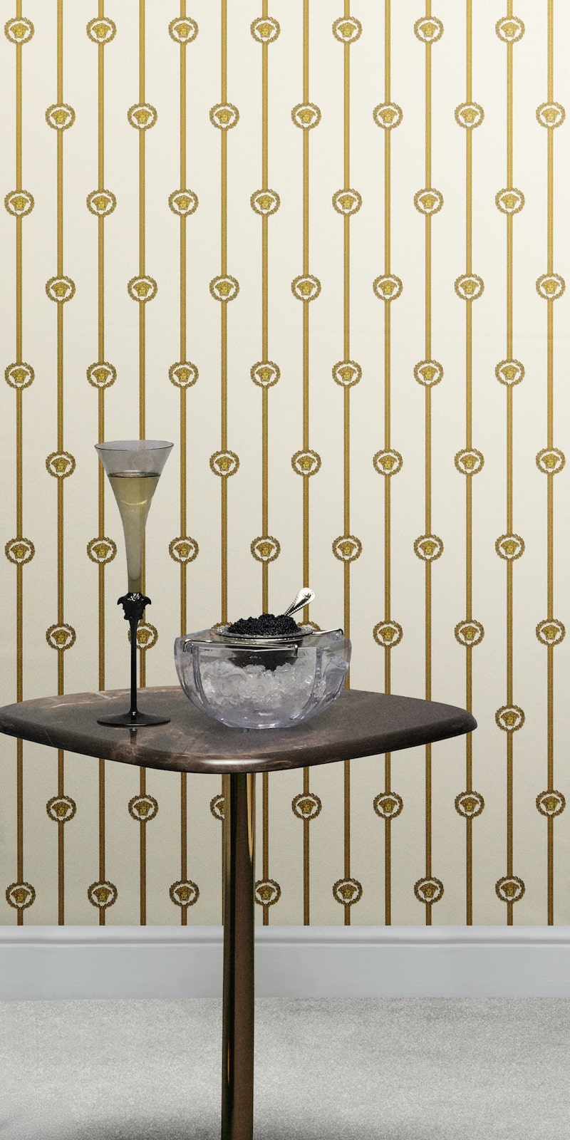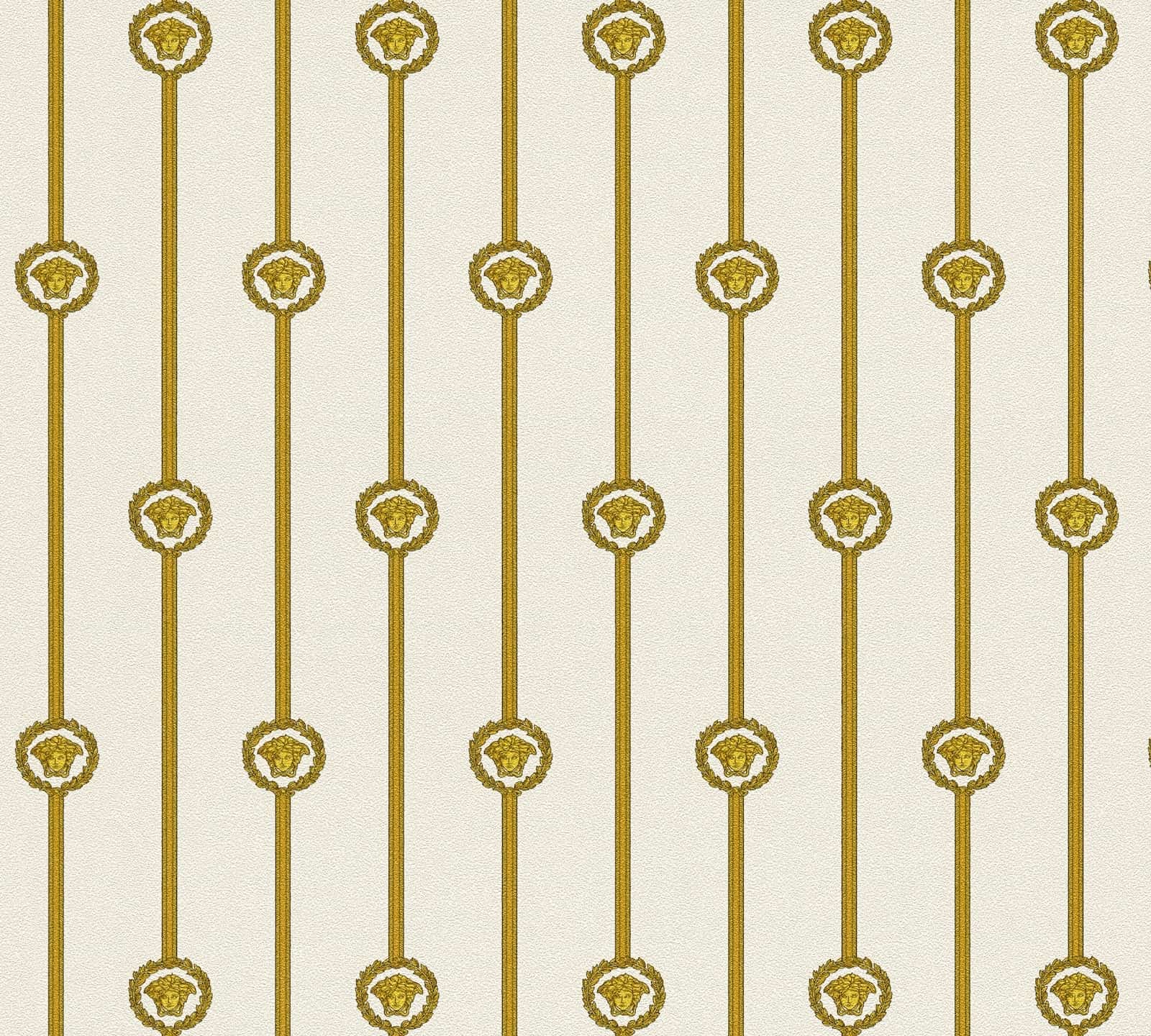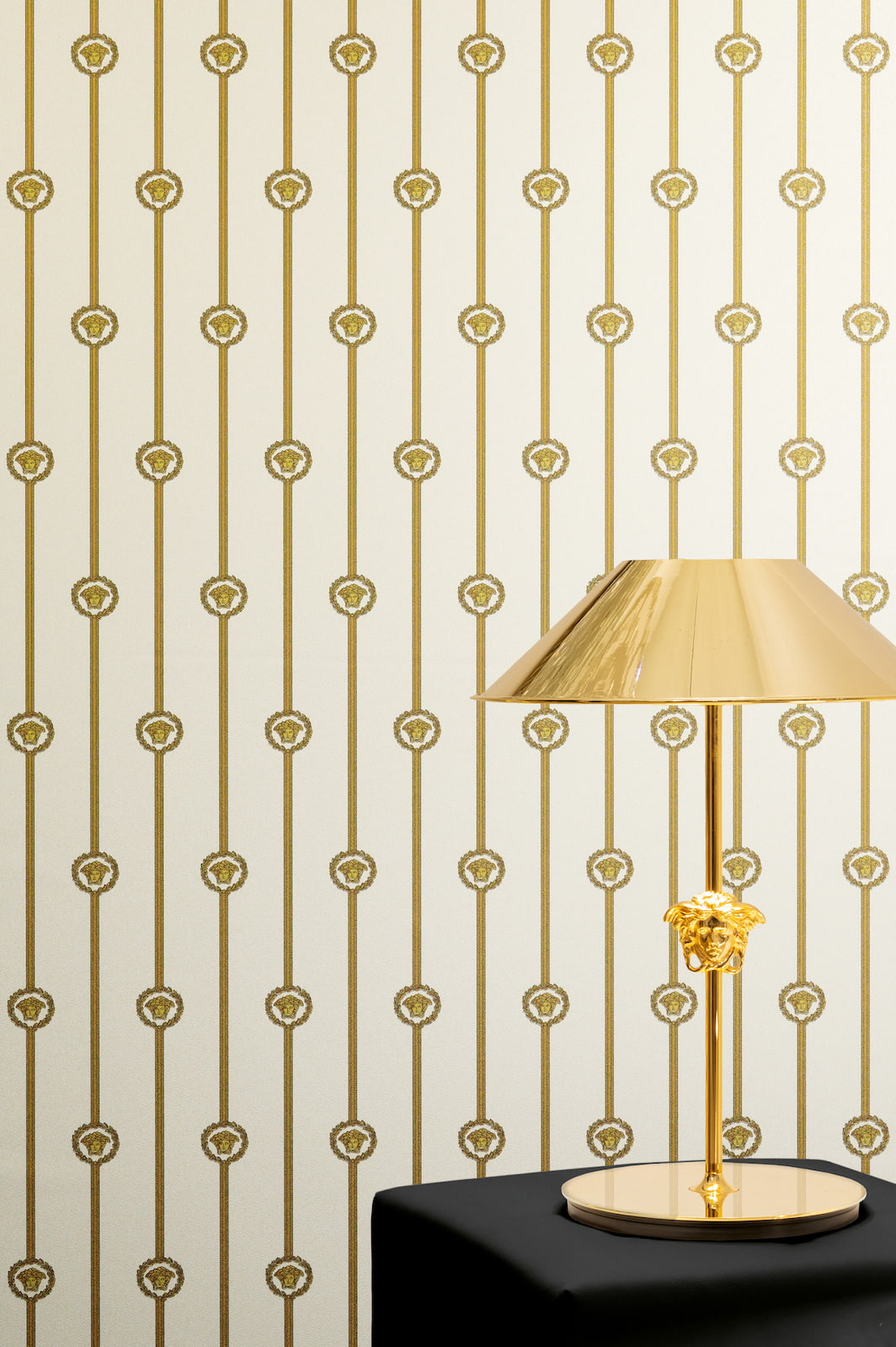 This elegant wallpaper from AS Creation's sixth wallpaper collection in collaboration with Versace opens a new chapter in luxurious wall coverings. Inspired by the DNA of the Versace fashion house, it is interpreted in a contemporary design language. The non-woven wallpaper 79173-1 features a striped motif with the Medusa emblem in cream tones with a metallic gold effect. Discover the complete collection in our shop and bring a touch of luxury into your home.