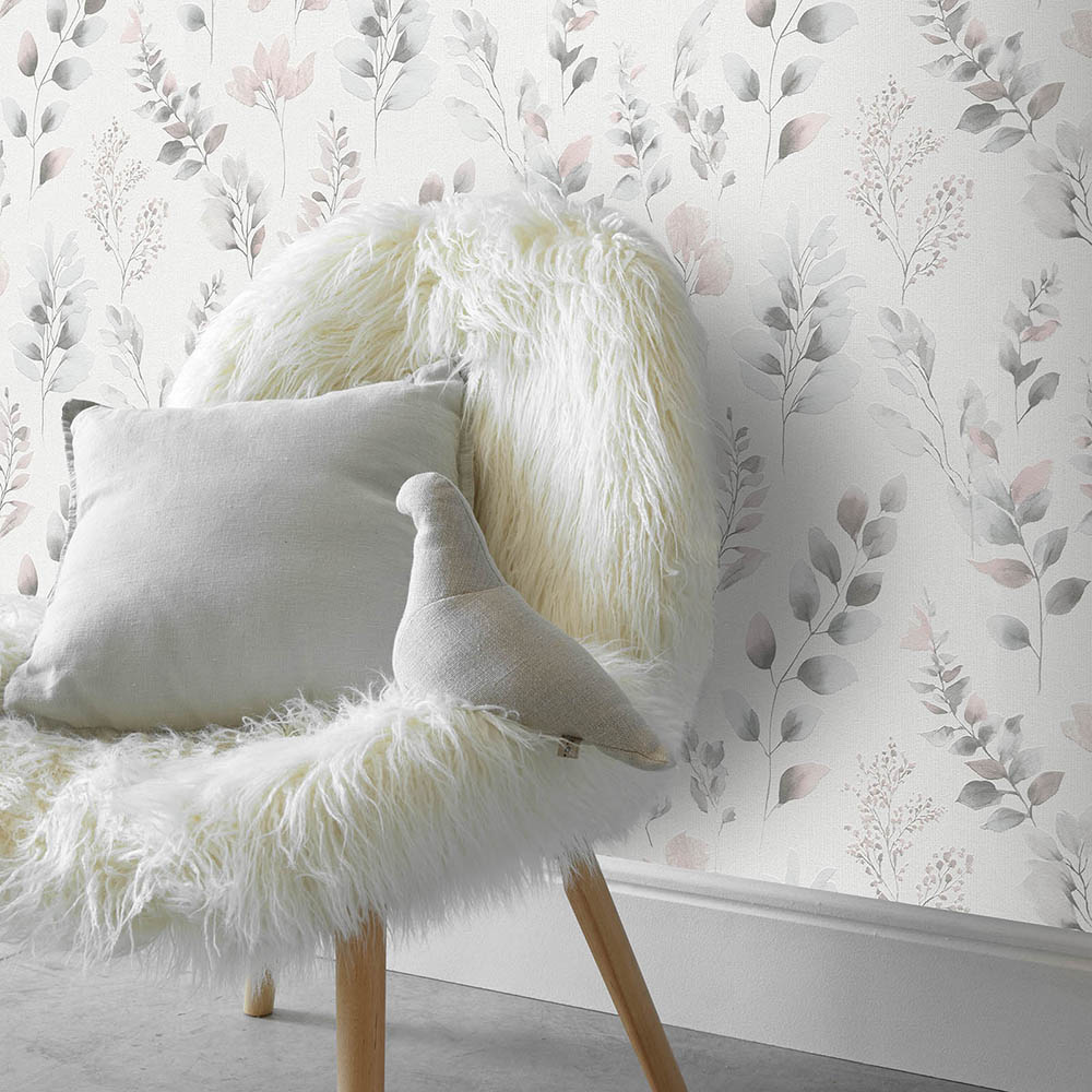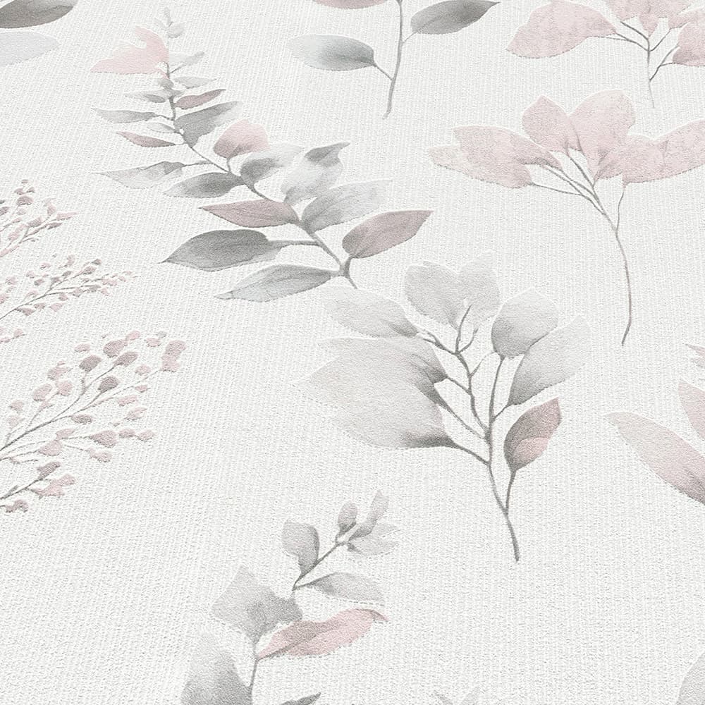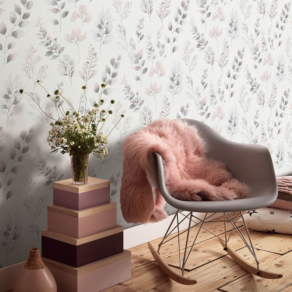 This wallpaper from the Moments26 spring special edition by star designer Guido Maria Kretschmer harmoniously blends naturalness, texture, and style. It offers stylish options for anyone who wants to create rooms with character. The non-woven wallpaper 10579-05 features a floral leaf pattern in a watercolor style, in white, pink, and gray tones. Discover other non-woven wallpapers by Guido Maria Kretschmer in our shop.
