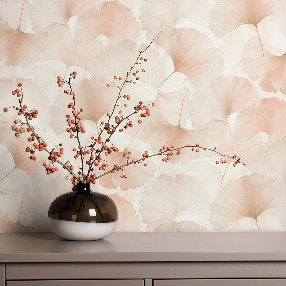 With this wallpaper from the "Elysium" collection by Erismann, you can stylishly design your rooms and turn them into a visual highlight. Timeless elegance meets modern extravagance, transforming every wall into a true eye-catcher. The non-woven wallpaper 10470-05 features a floral motif with gingko leaves in pink and cream tones with a glitter effect. Discover the entire collection now in our shop.