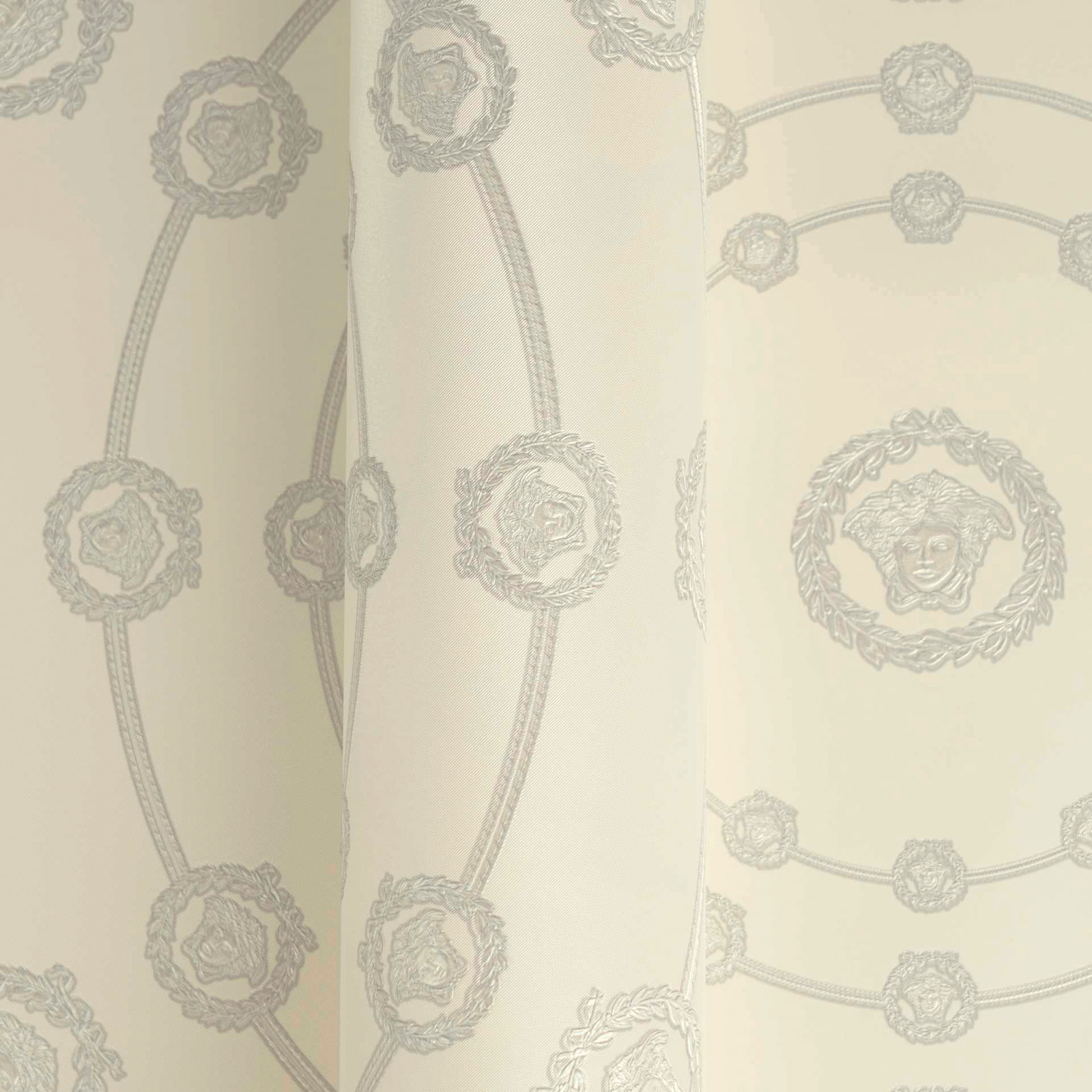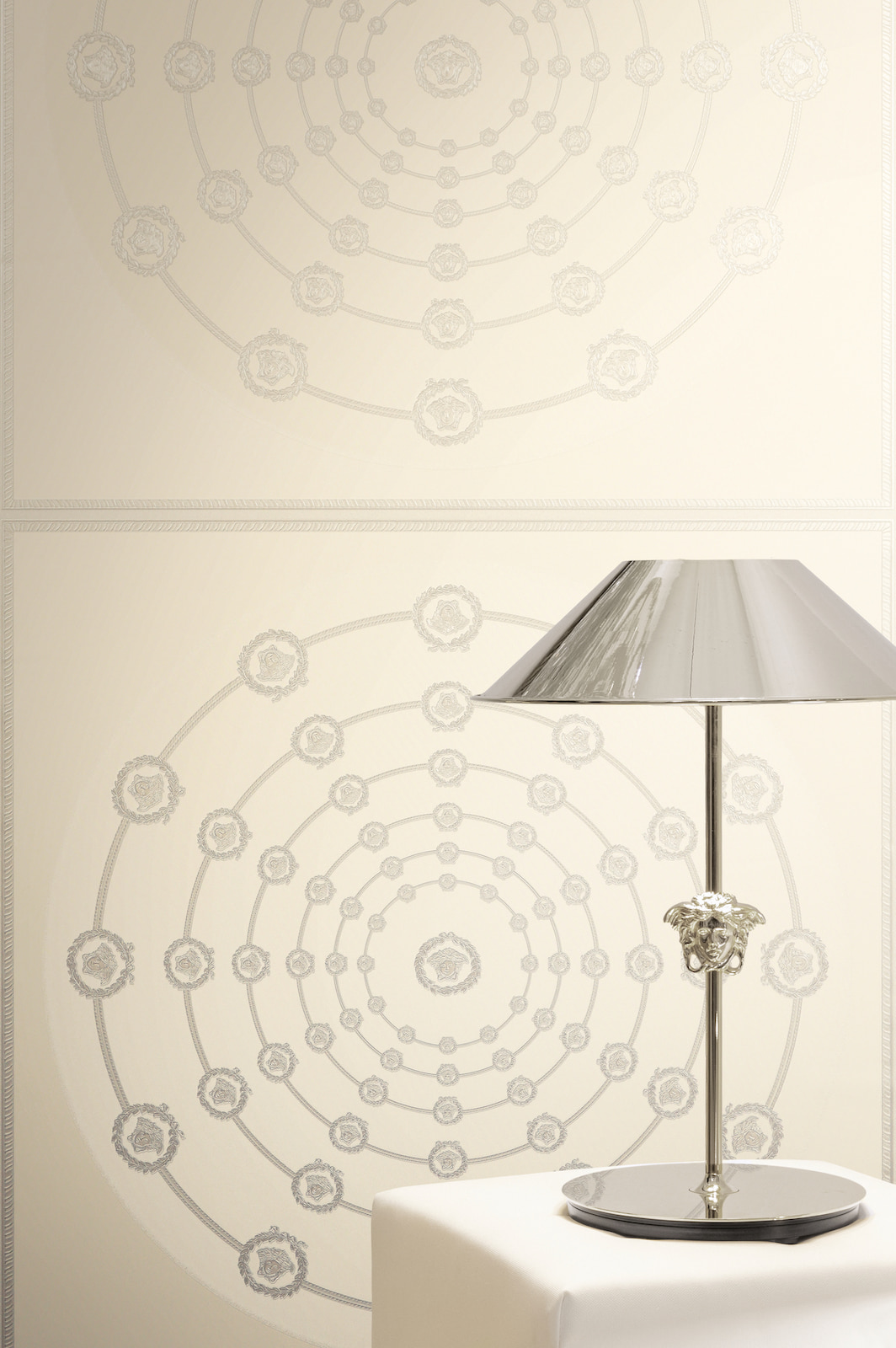 This elegant wallpaper from AS Creation's sixth wallpaper collection in collaboration with Versace opens a new chapter in luxurious wall decoration. Inspired by the DNA of the Versace fashion house, it is interpreted in a contemporary design language. The non-woven wallpaper 79175-2 features a graphic motif with circles and the Medusa emblem in cream tones with a metallic effect in cream and silver. Discover the complete collection in our shop and bring a touch of luxury into your home.