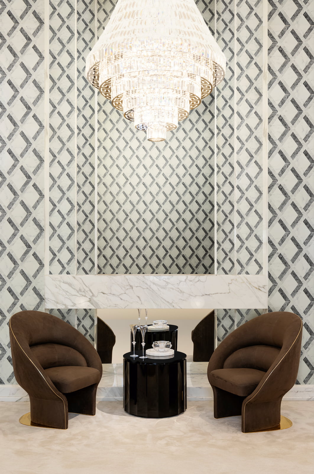 This exquisite wallpaper, from AS Creation's sixth wallpaper collection in collaboration with Versace, opens a new chapter in luxurious wall coverings. Inspired by the DNA of the Versace fashion house, it is interpreted with a contemporary design language. The non-woven wallpaper 79133-3 features a graphic diamond pattern with a 3D marble effect in shades of gray and black. Discover the complete collection in our shop and bring a touch of luxury into your home.