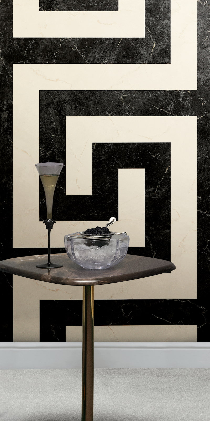 This elegant wallpaper from AS Creation's sixth wallpaper collection in collaboration with Versace opens a new chapter in luxurious wall coverings. Inspired by the DNA of the Versace fashion house, it is interpreted in a contemporary design language. The non-woven wallpaper 79174-1 features a graphic meander pattern with a marble effect in black and white with a metallic gold finish. Discover the complete collection in our shop and bring a touch of luxury into your home.