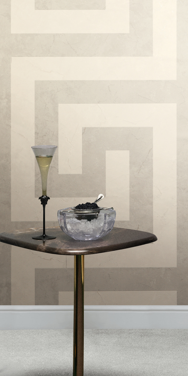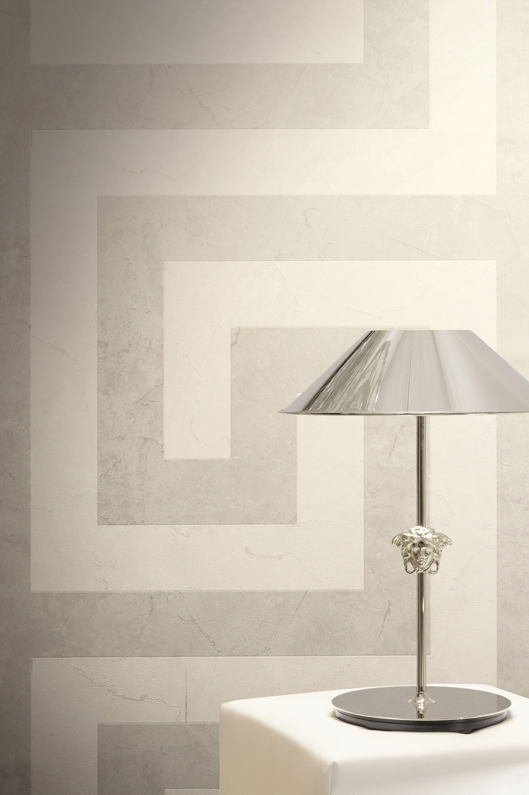 This elegant wallpaper from AS Creation's sixth wallpaper collection in collaboration with Versace opens a new chapter in luxurious wall coverings. Inspired by the DNA of the Versace fashion house, it is interpreted in a contemporary design language. The non-woven wallpaper 79174-5 features a graphic meander pattern with a marble effect in shades of gray and cream, with a metallic pearlescent finish. Discover the complete collection in our shop and bring a touch of luxury into your home.