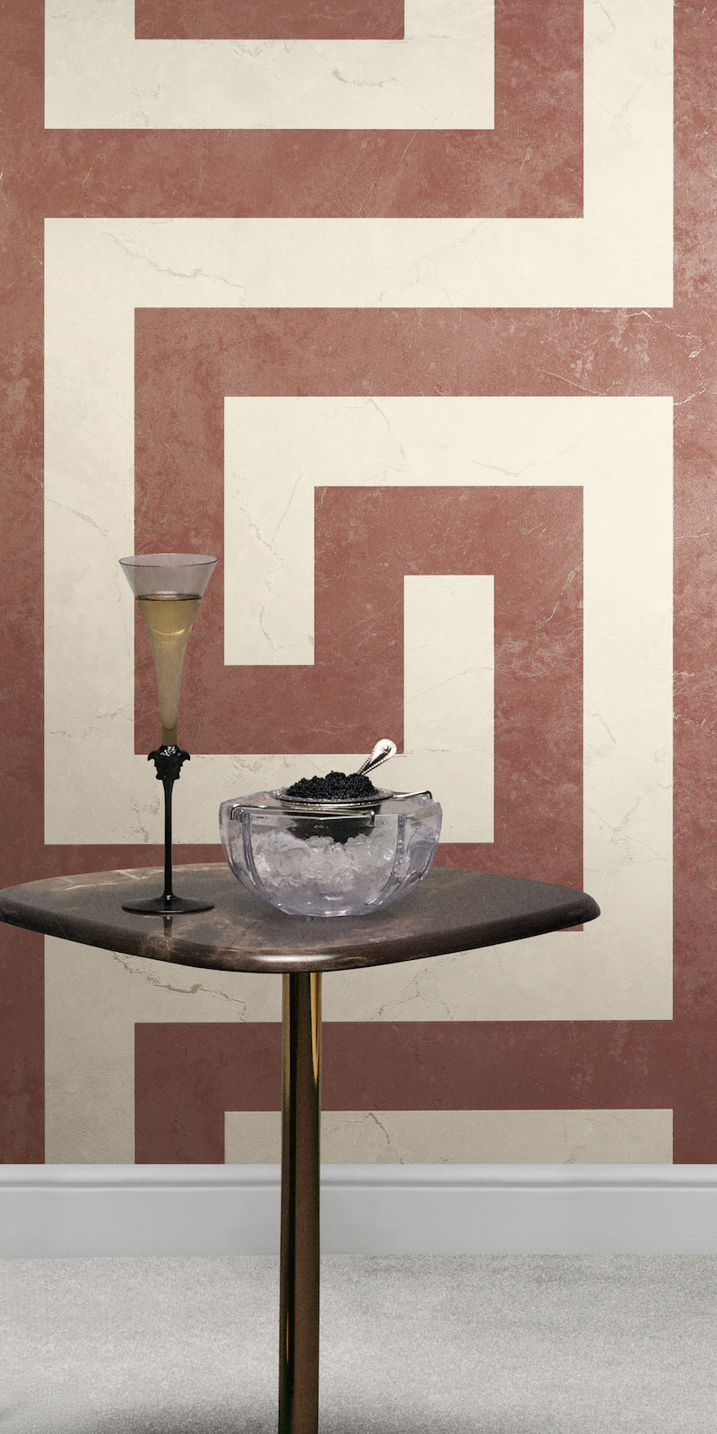 This elegant wallpaper from AS Creation's sixth wallpaper collection in collaboration with Versace opens a new chapter in luxurious wall coverings. Inspired by the DNA of the Versace fashion house, it is interpreted in a contemporary design language. The non-woven wallpaper 79174-2 features a graphic meander pattern with a marble effect in shades of red and cream, accented with metallic gold and mother-of-pearl. Discover the complete collection in our shop and bring a touch of luxury into your home.