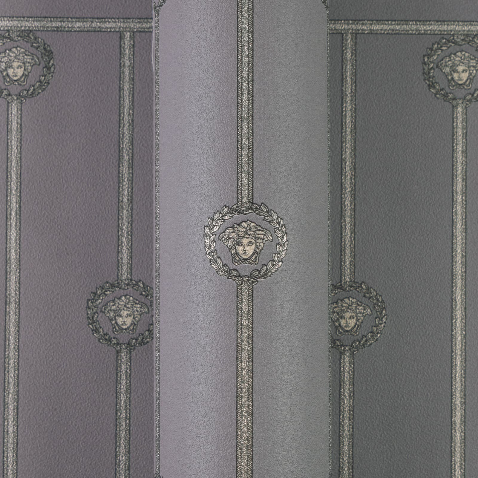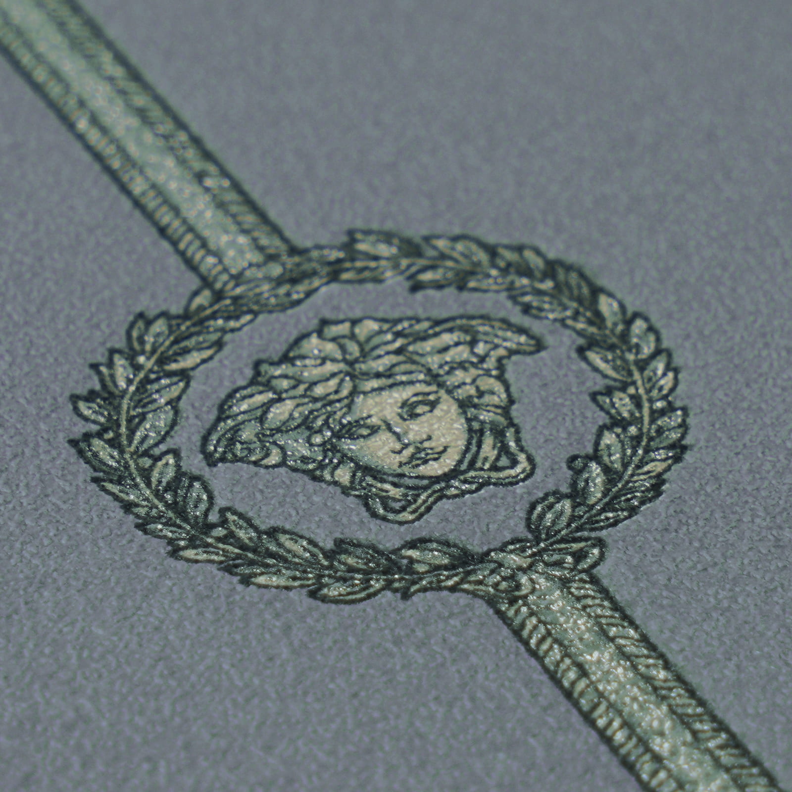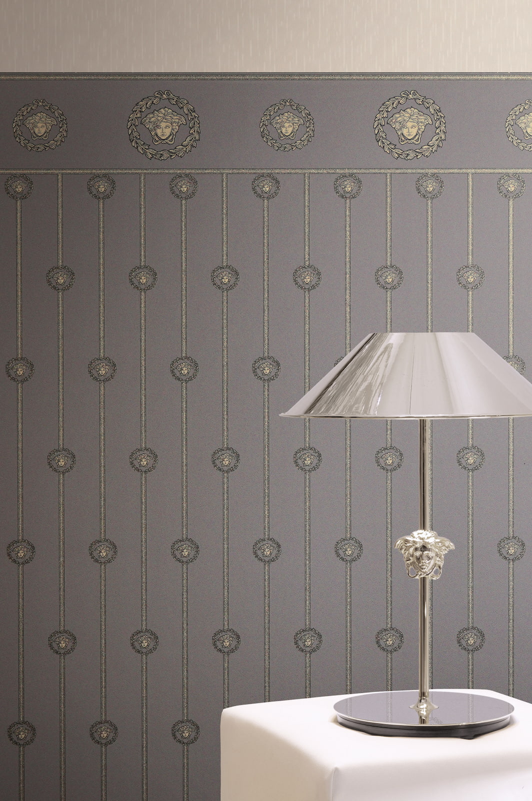 This exquisite wallpaper, from AS Creation's sixth wallpaper collection in collaboration with Versace, opens a new chapter in luxurious wall coverings. Inspired by the DNA of the Versace fashion house, it is interpreted in a contemporary design language. The non-woven wallpaper 79131-4 features a motif with vertical stripes and a border-like band, emblazoned with the Medusa emblem in shades of gray with a metallic gold effect. Discover the complete collection in our shop and bring a touch of luxury into your home.