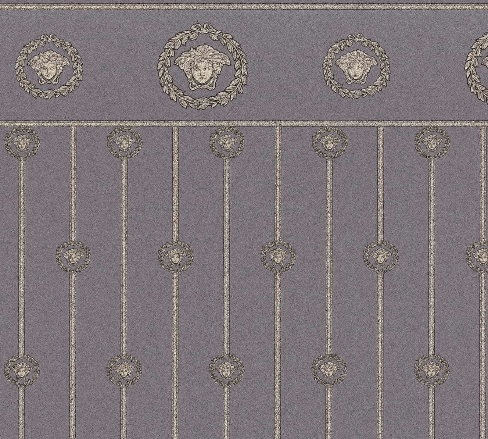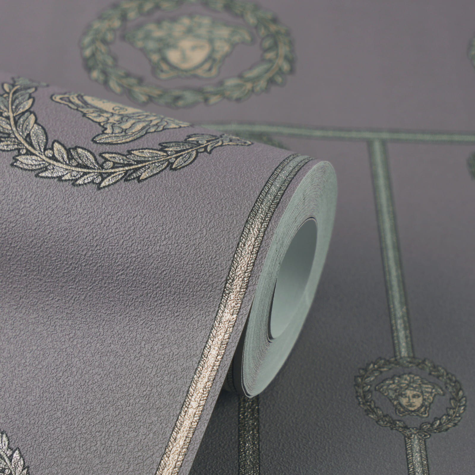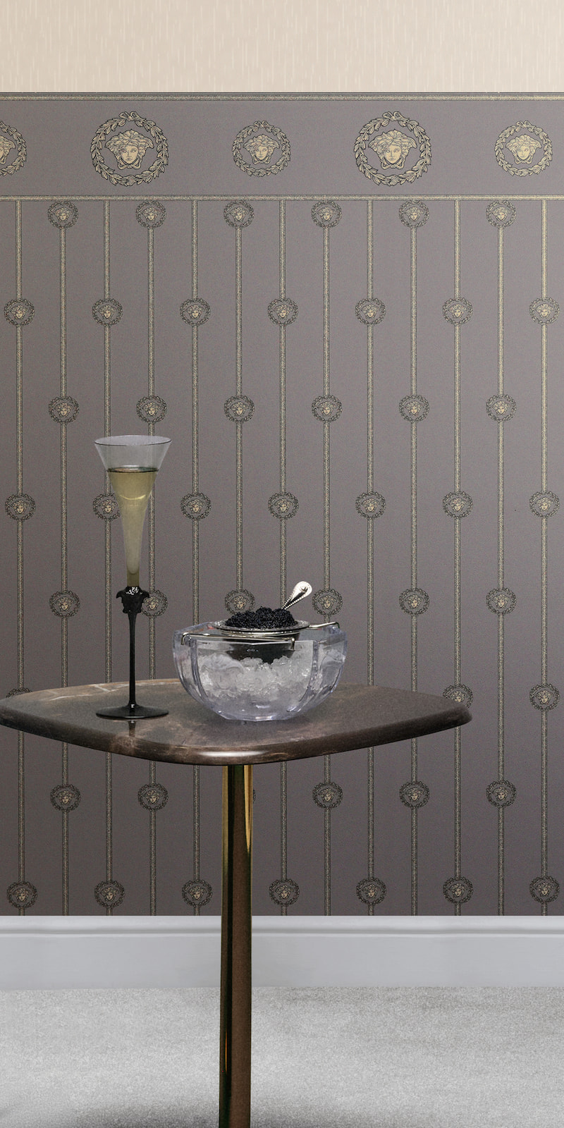 This exquisite wallpaper, from AS Creation's sixth wallpaper collection in collaboration with Versace, opens a new chapter in luxurious wall coverings. Inspired by the DNA of the Versace fashion house, it is interpreted in a contemporary design language. The non-woven wallpaper 79131-4 features a motif with vertical stripes and a border-like band, emblazoned with the Medusa emblem in shades of gray with a metallic gold effect. Discover the complete collection in our shop and bring a touch of luxury into your home.