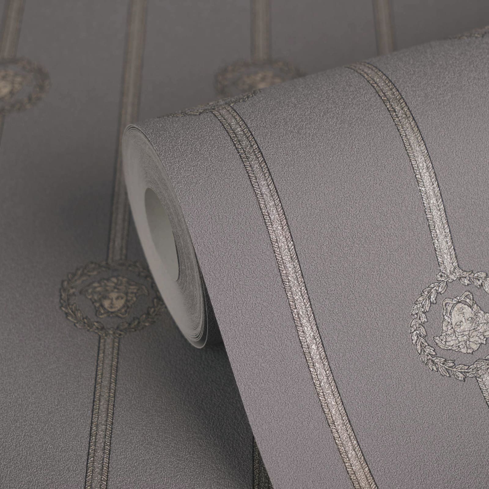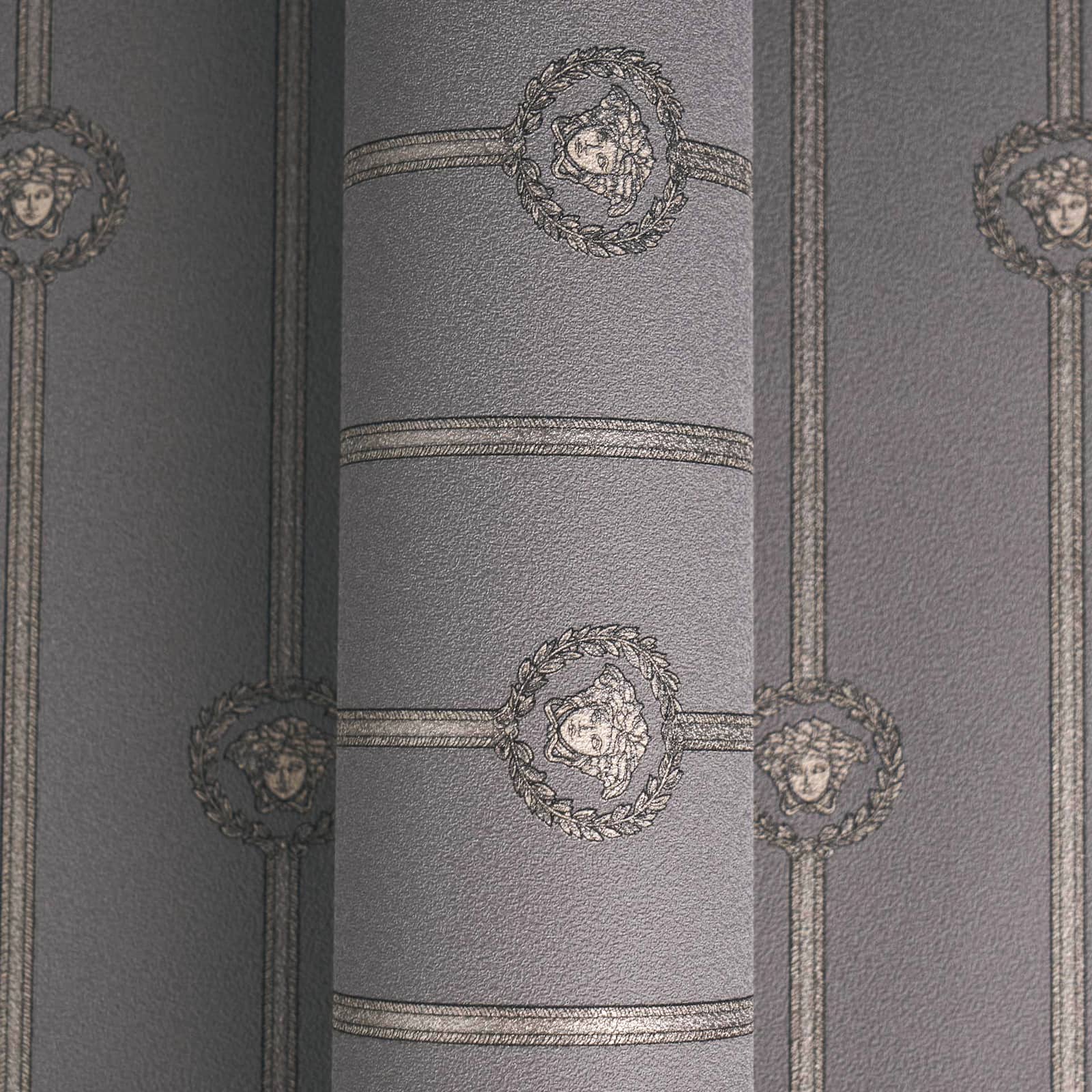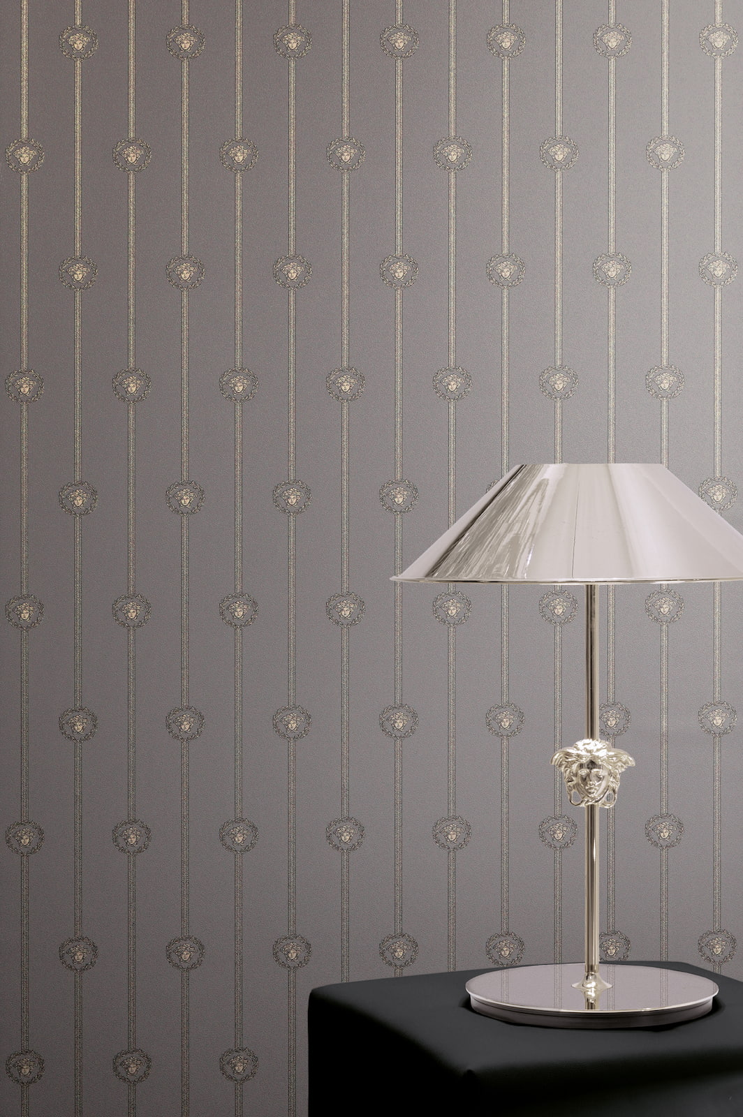 This elegant wallpaper from AS Creation's sixth wallpaper collection in collaboration with Versace opens a new chapter in luxurious wall coverings. Inspired by the DNA of the Versace fashion house, it is interpreted in a contemporary design language. The non-woven wallpaper 79173-4 features a striped motif with the Medusa emblem in shades of gray with a metallic gold effect. Discover the complete collection in our shop and bring a touch of luxury into your home.